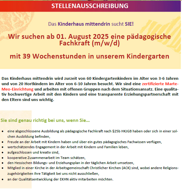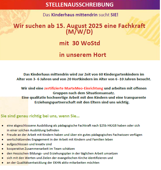 Fachkraft ab 15.08.2025 mit 30 Wochenstunden